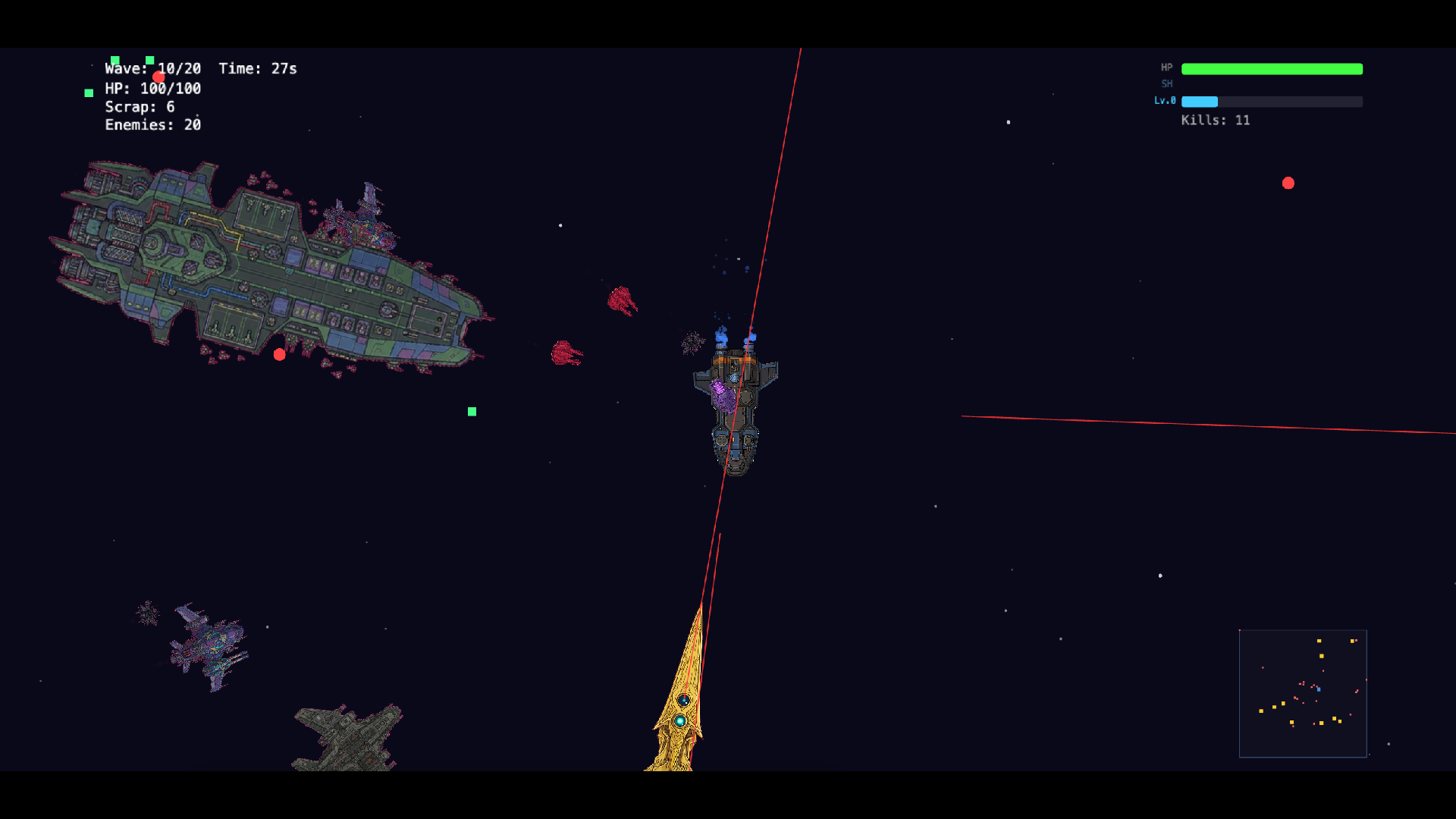 Starnut is a top-down space survival roguelike inspired by Brotato. Pilot a customizable ship through 20 escalating waves of scouts, gunners, bombers, swarms, and carriers — then face a 3-phase boss at the end of the run. Weapons auto-fire; you dodge, position, and build.