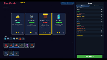 - Deep stat system — fire rate, crit, range, armor, regen, harvesting, engineering, luck, XP gain.